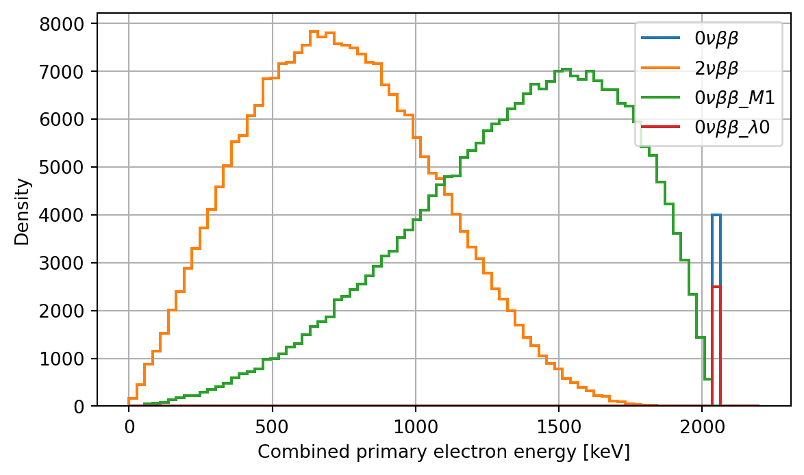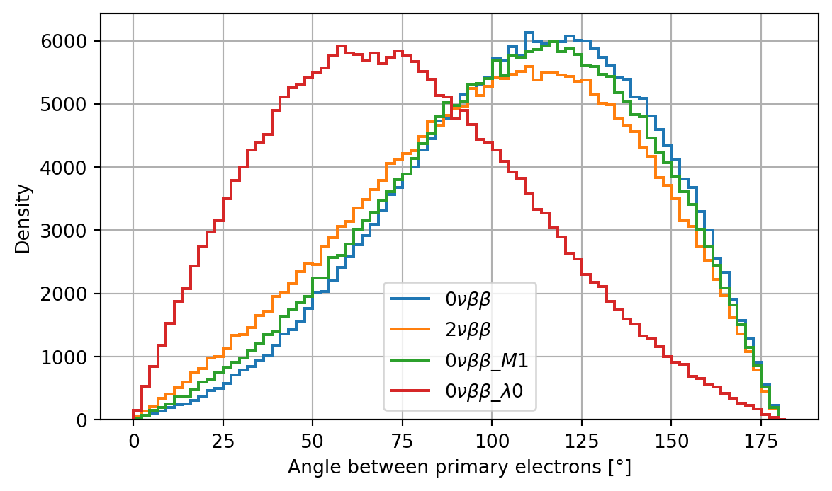 Here \(2\nu\beta\beta\) is the two neutrino double beta decay as predicted by the Standard Model. \(0\nu\beta\beta\) is the neutrinoless double beta decay channel (assuming light majorana neutrino exchange) used for e.g. sensitivity estimates by experiments like LEGEND. More exotic physics like the Majoron-emitting neutrinoless double beta decay with SI=1 \(0\nu\beta\beta\_M1\) shows a distinctive continuous electron spectrum. Other exotic physics like the \(0\nu\beta\beta\_\lambda0\) is a decay mode driven by right-handed currents according to the lambda mechanism and shows a distinctive angular correlation.
