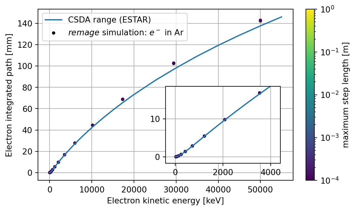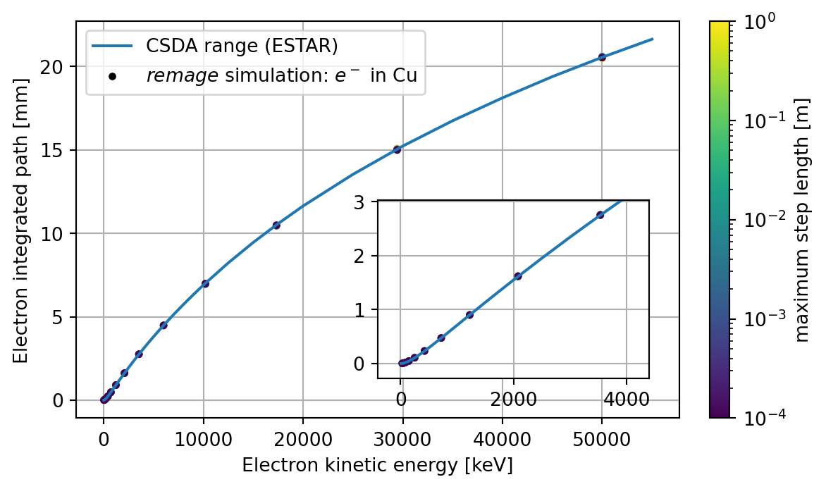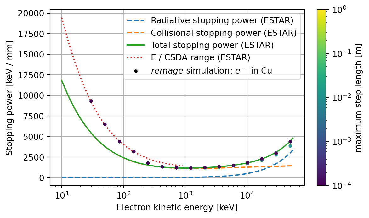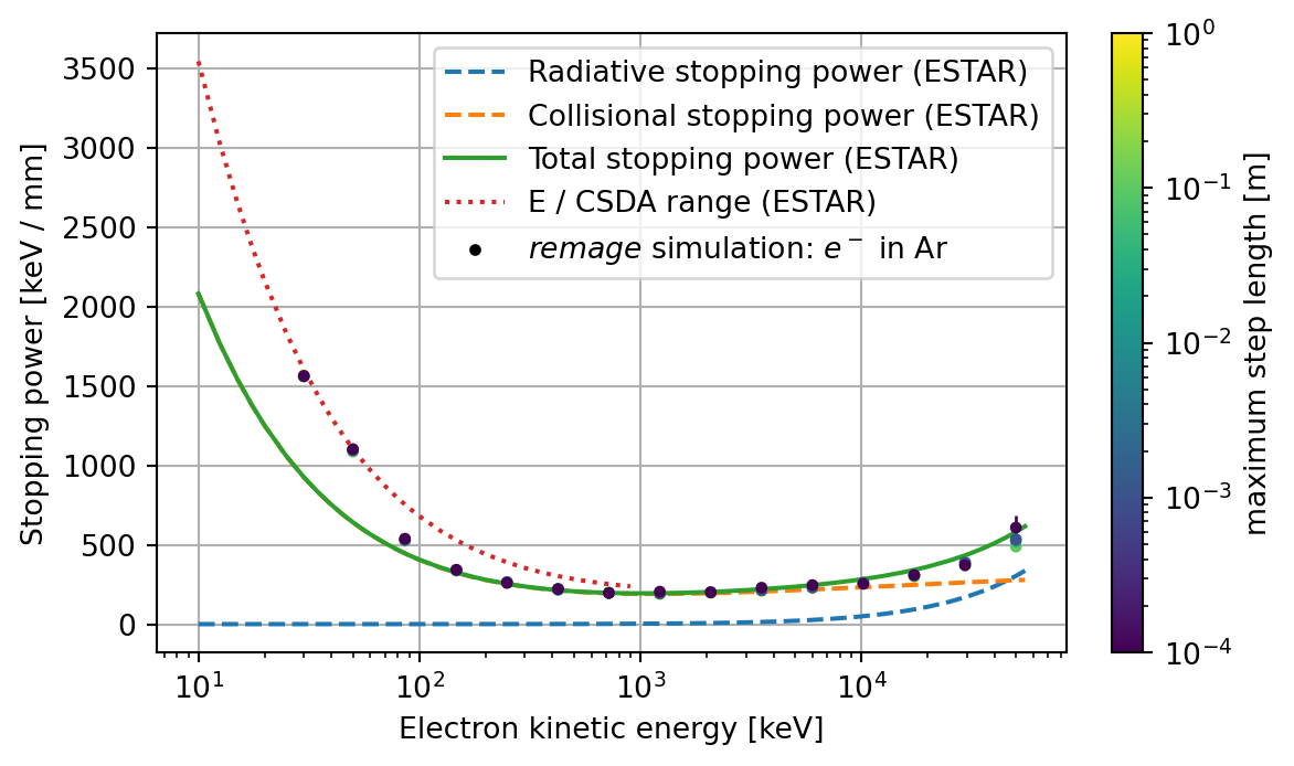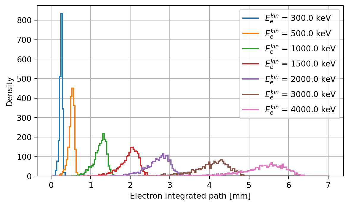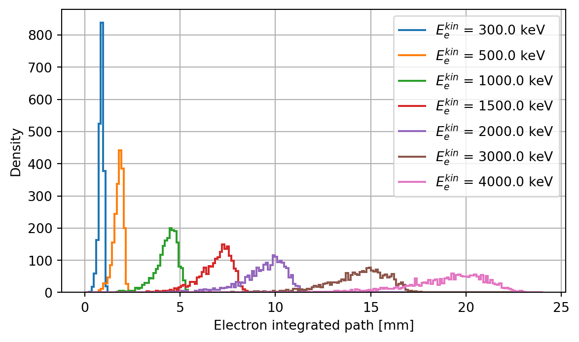 We calculate stopping power and integrated path length of the simulated electrons and compare them with data from the ESTAR database (a short description of the reported quantities is available here).