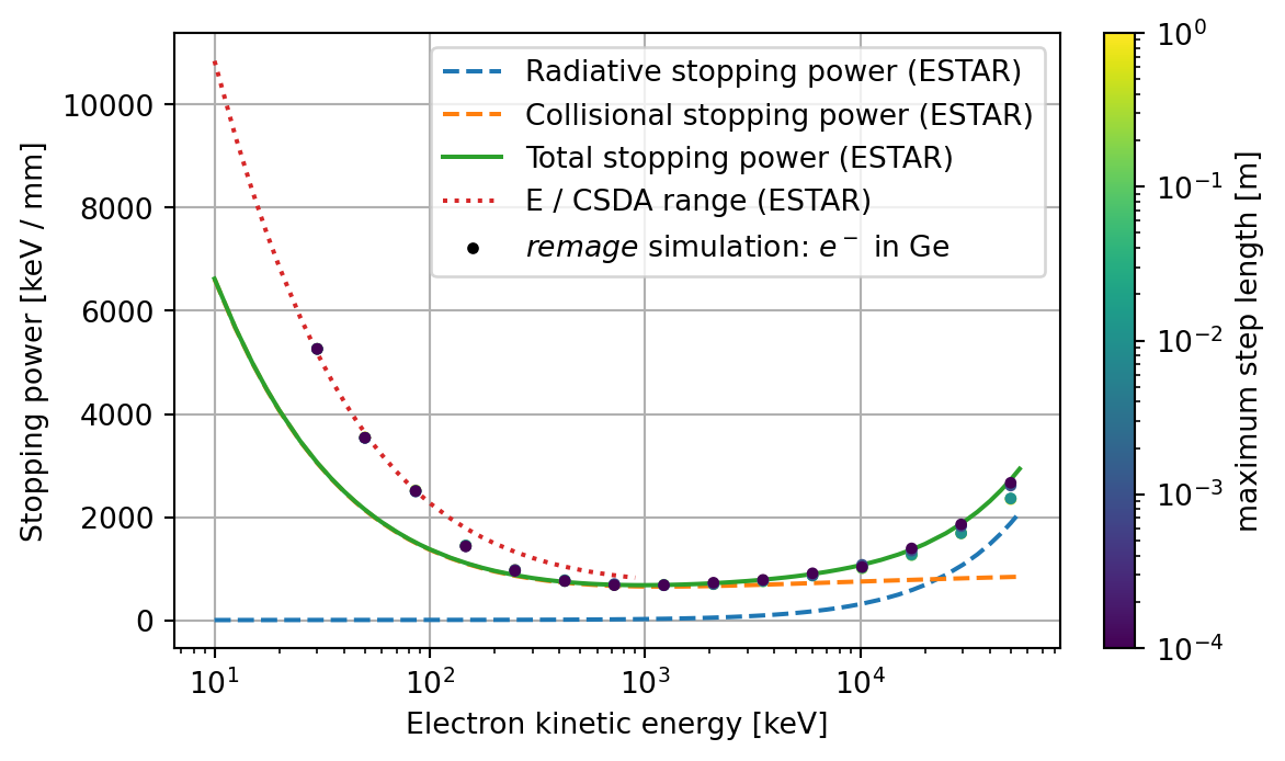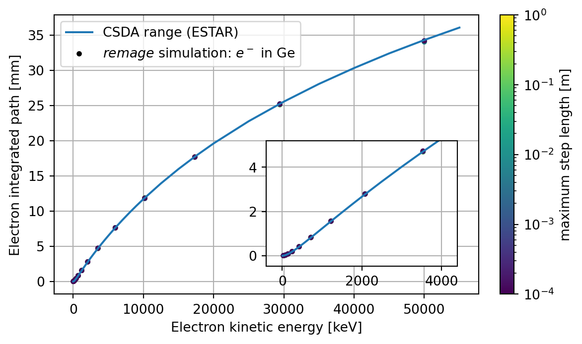 Simulation of electrons in natural germanium with default settings (i.e. no tuning of production cuts or step length).¶