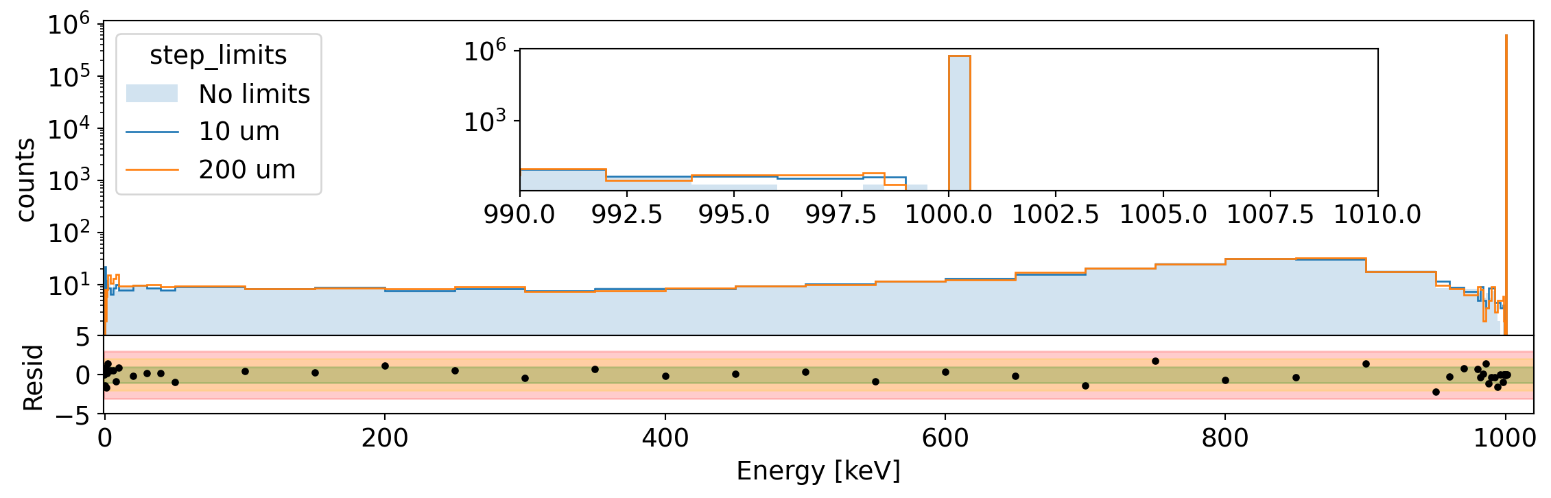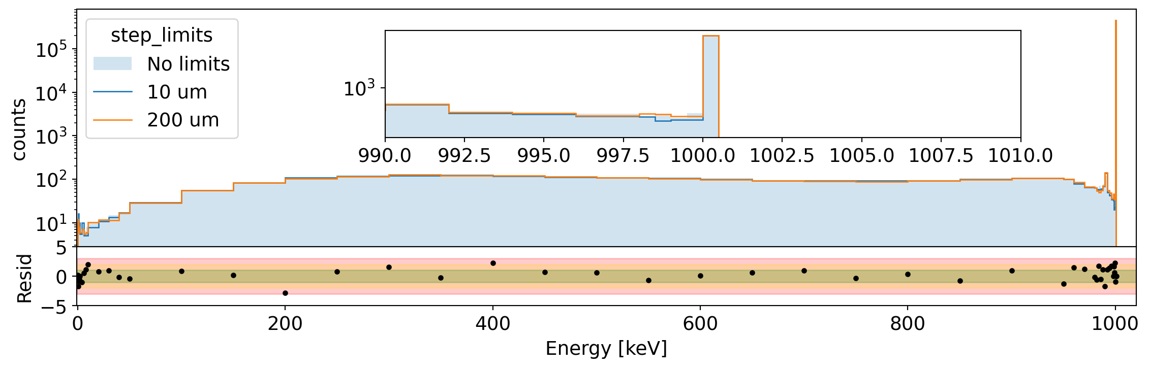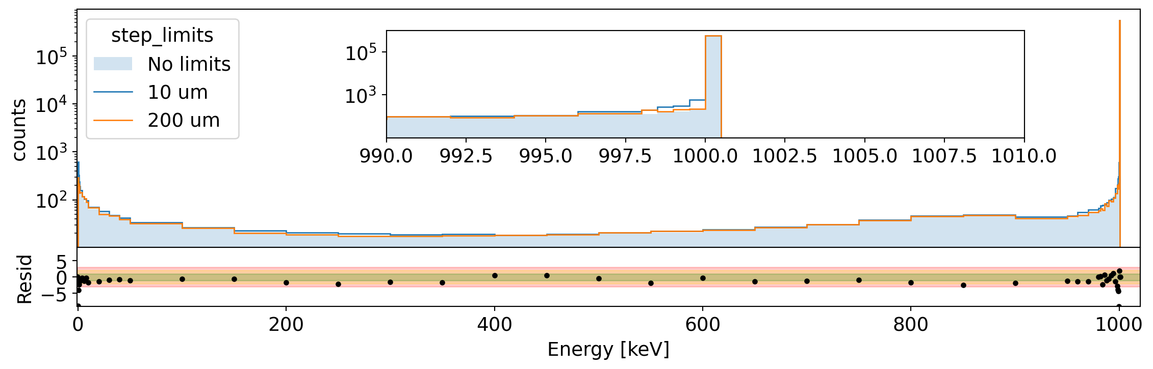Spectrum of total energy in Germanium for 1 MeV electrons generated uniformly in the volume. We compare the spectrum without step limits to that with 10 um and 200 um limit. The residual shows the difference between the two extreme cases.¶