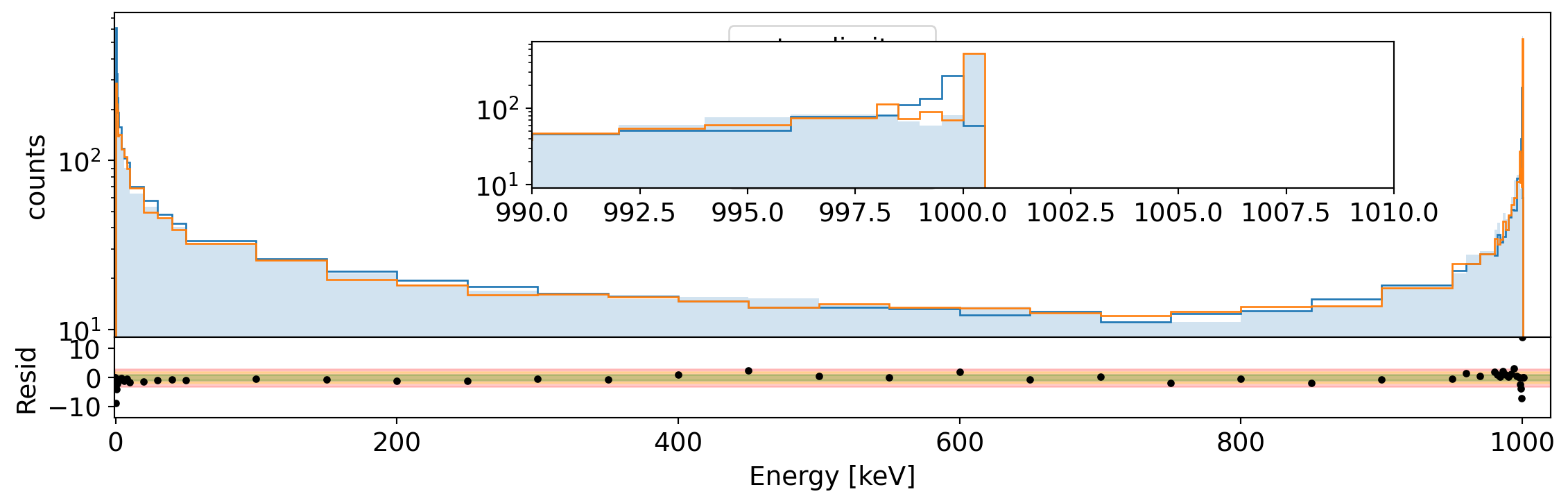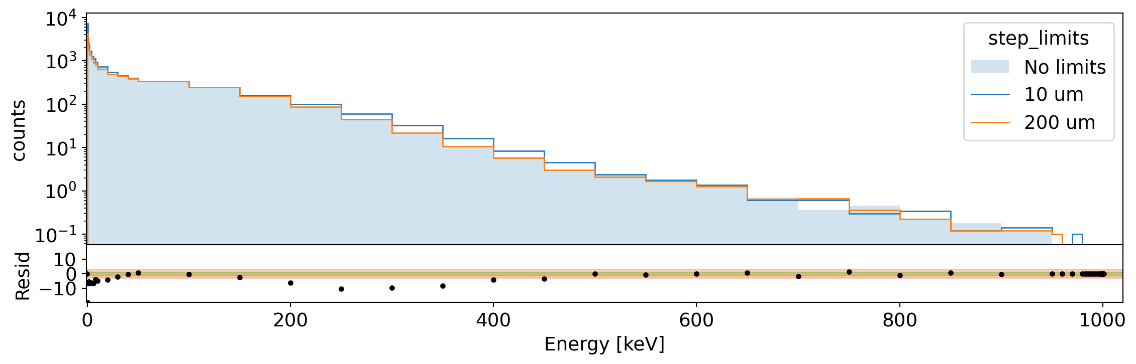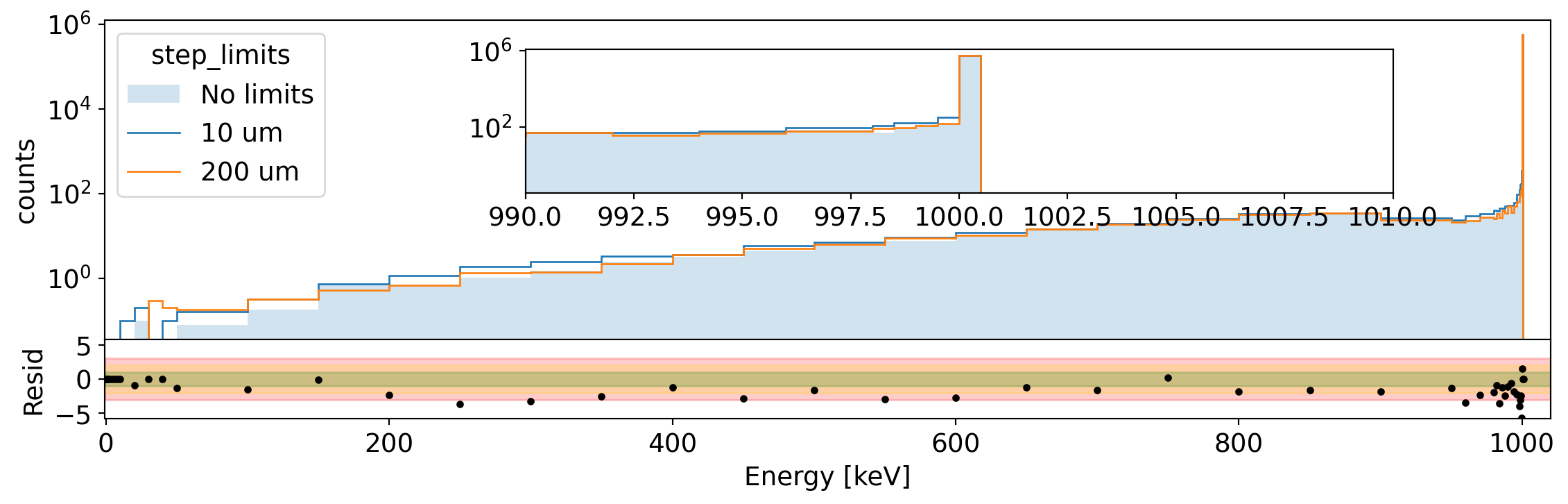 Spectrum of total energy in Germanium for 1 MeV electrons generated uniformly in the volume. We compare the spectrum without step limits to that with 10 um and 200 um limit. The residual shows the difference between the two extreme cases.¶