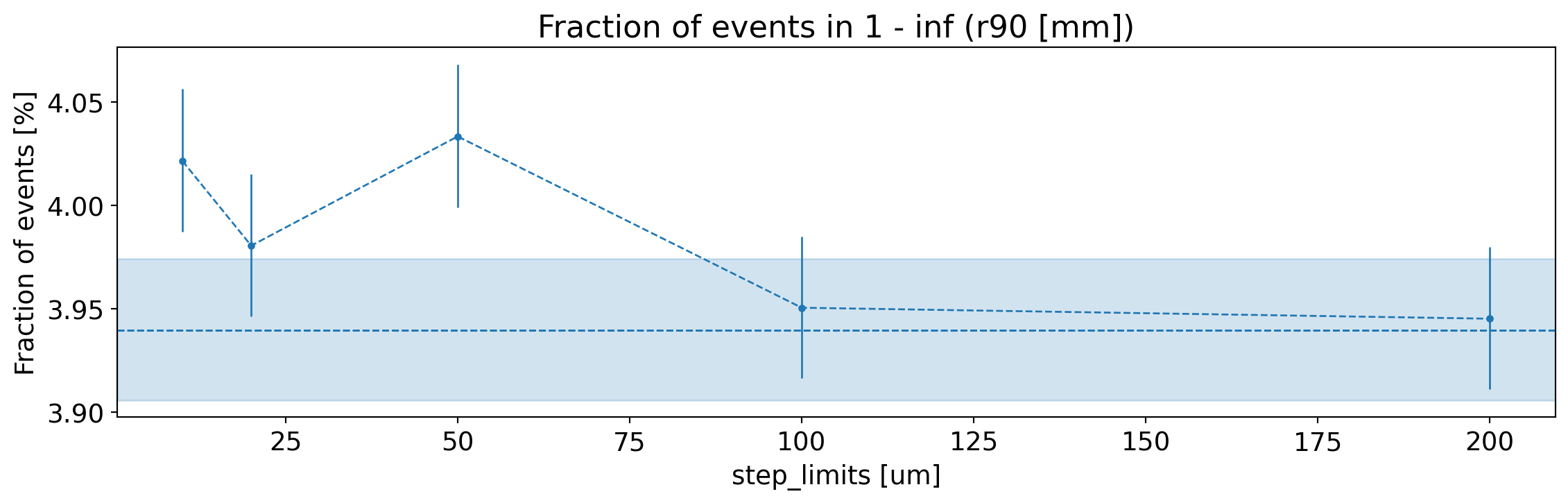 To quantify the effect of the step limits on our observable of interest (the fraction of multisite events), we compute the fraction of events with > 1 mm r90.