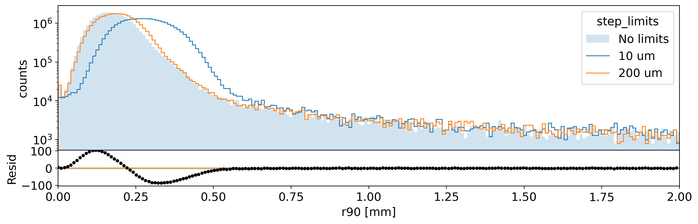 Spectrum of r90 in Germanium for 1 MeV electrons generated on the surface. We compare the spectrum without step limits to that with 10 um and 200 um limit. The residual shows the difference between the two extreme cases.¶