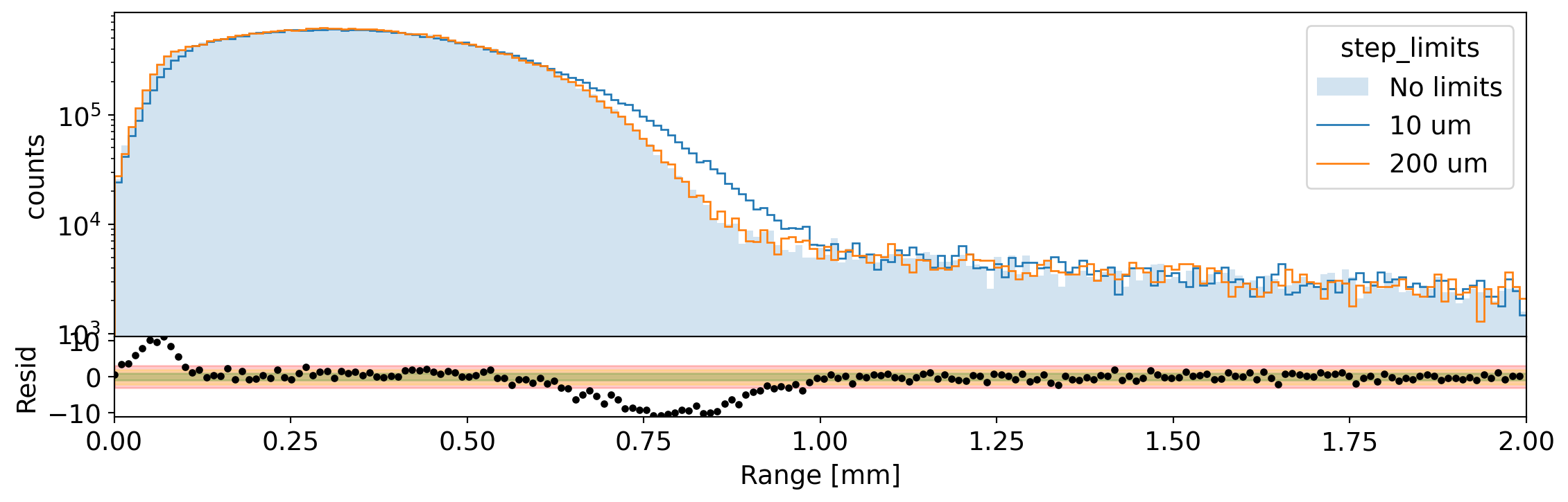 Distribution of the range of the electrons in Germanium for 1 MeV electrons generated on the surface. We compare the spectrum without step limits to that with 10 um and 200 um limit. The residual shows the difference between the two extreme cases.¶