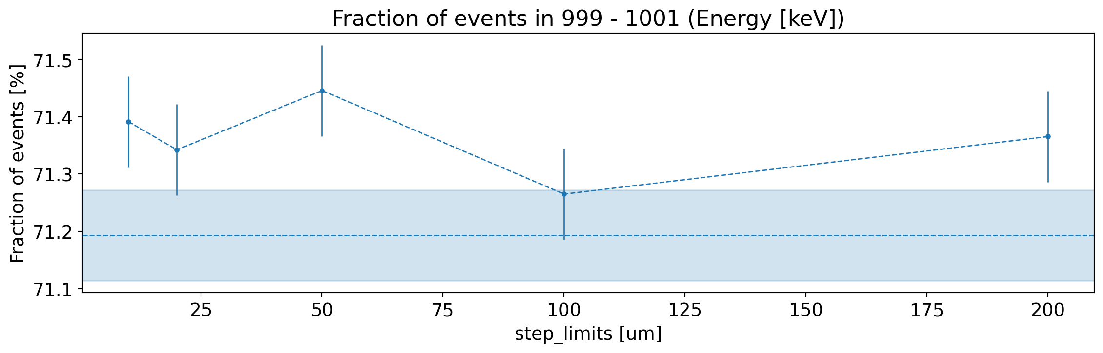 We generate 1 MeV electrons in the bulk of the Germanium detector varying the step limits and production cuts. This is relevant both for the simulation of neutrinoless double beta decay but also any gamma’s depositing energy in the HPGe. This is since a change in the fraction of electrons with fully reconstructed energy will change the peak-to-continuum ratio for the gamma simulation.