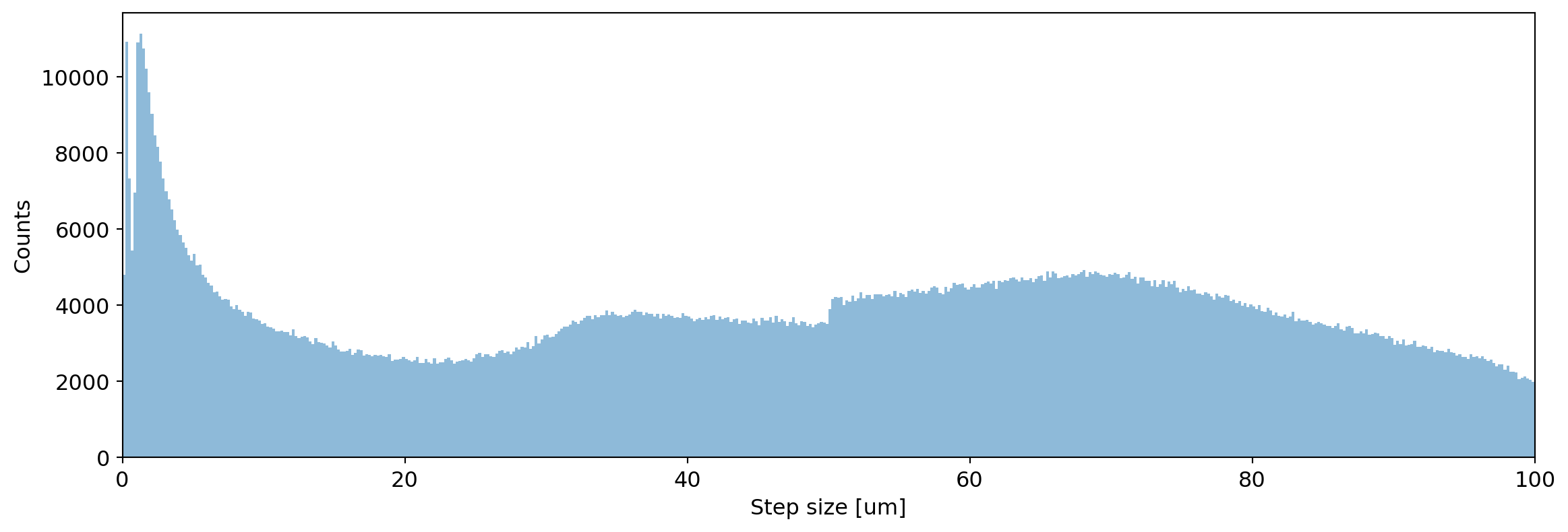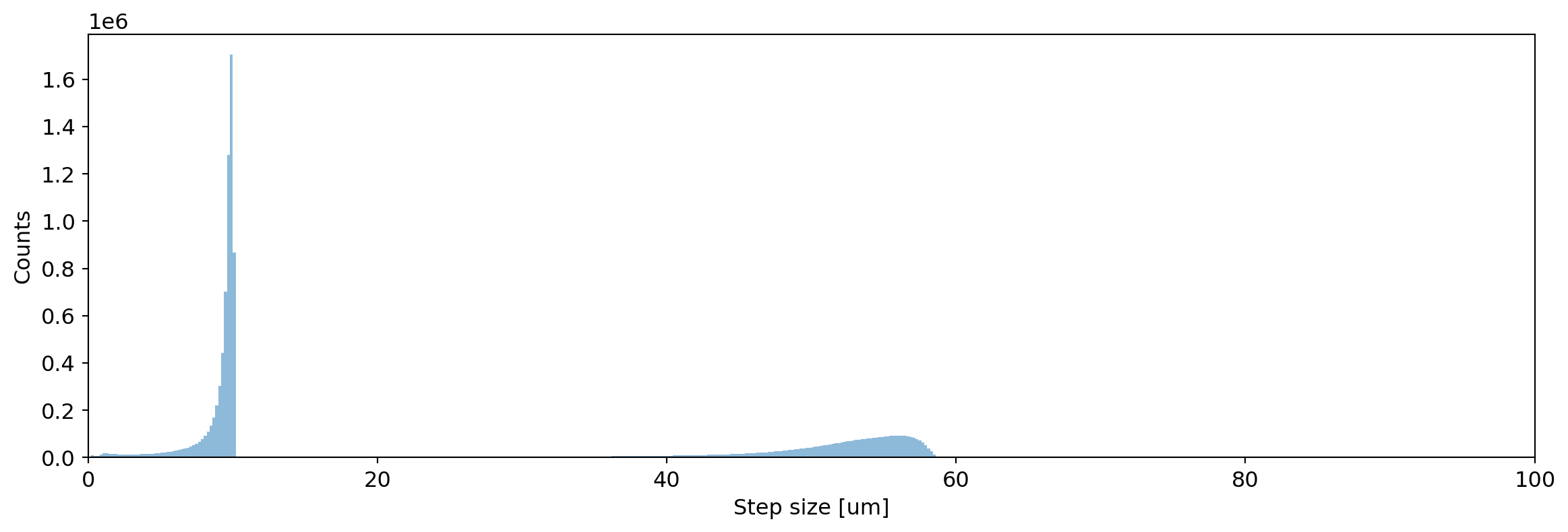 Step length distributions for 1 MeV electrons in Germanium. You should see the step lengths be limited to 10 um in the second case.¶