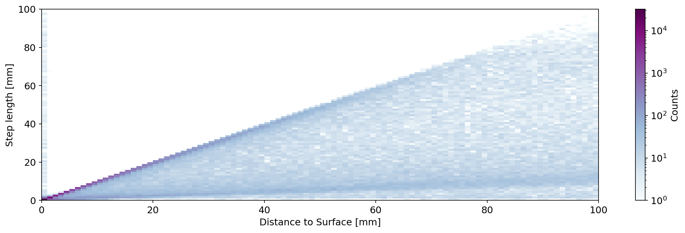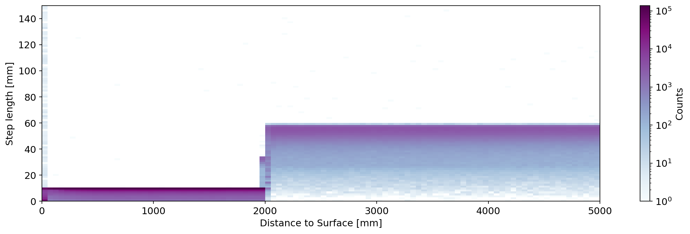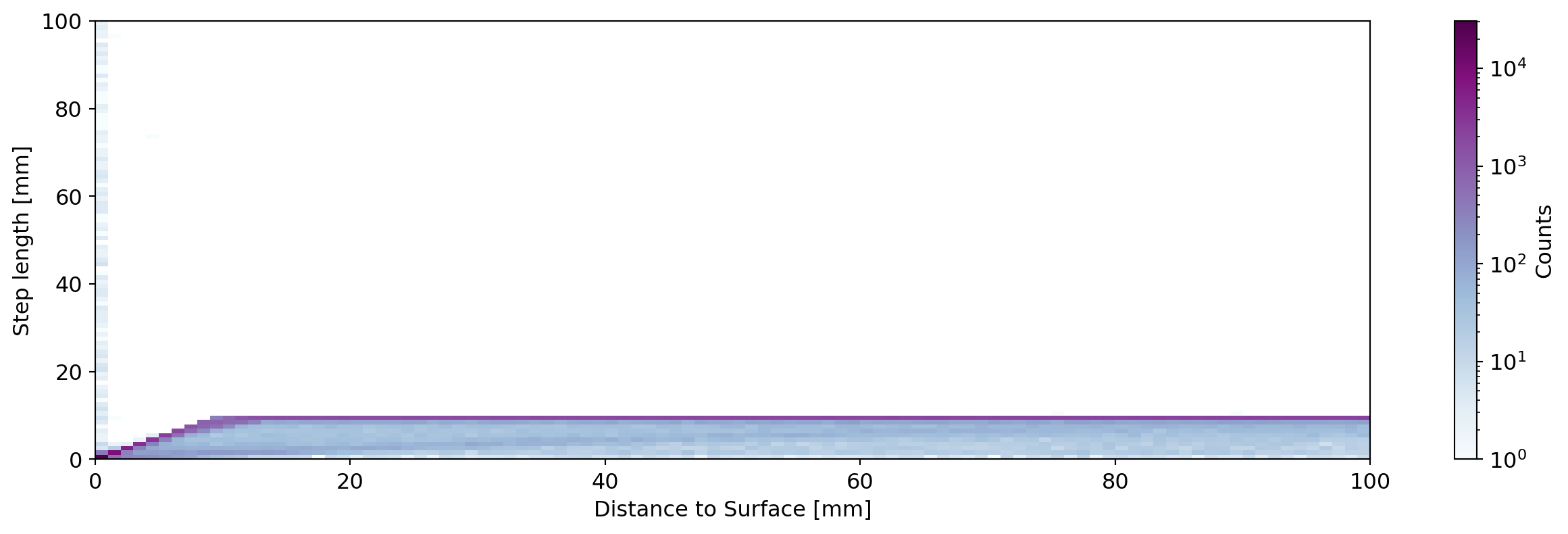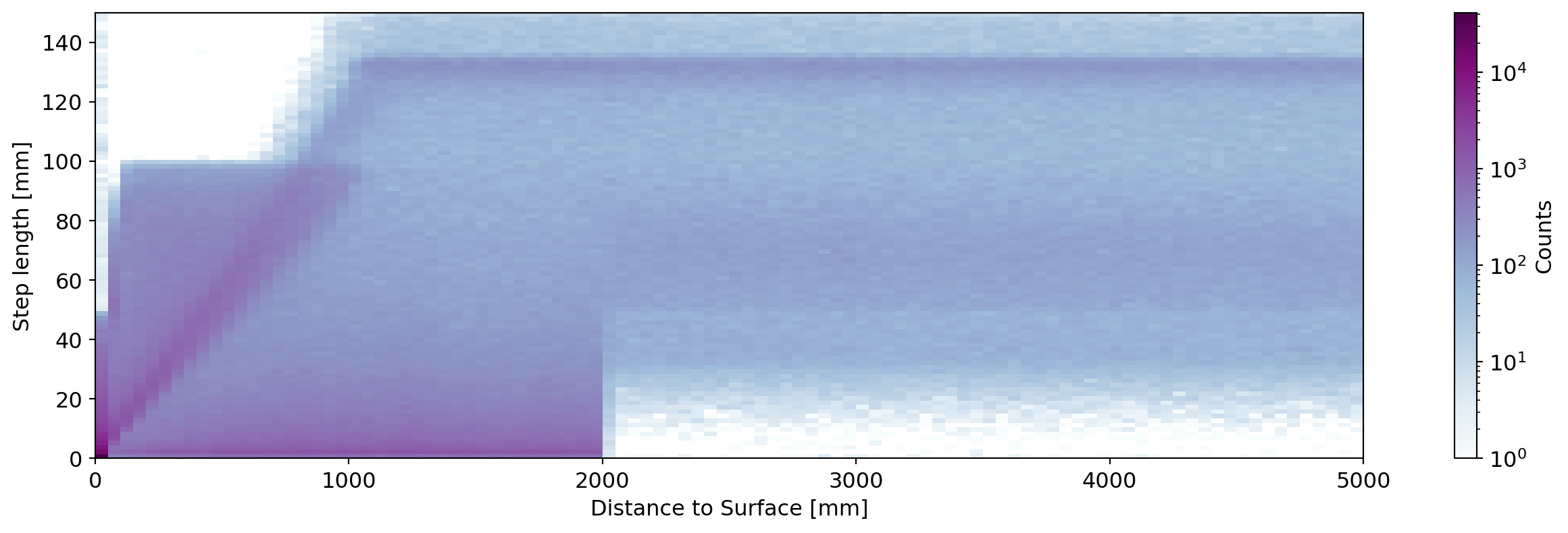 Next we plot the distribution of step lengths, and the joint distribution with the distance of the steps to the detector surface. This is shown for a large range of distances and also zooming into events close to the surface.