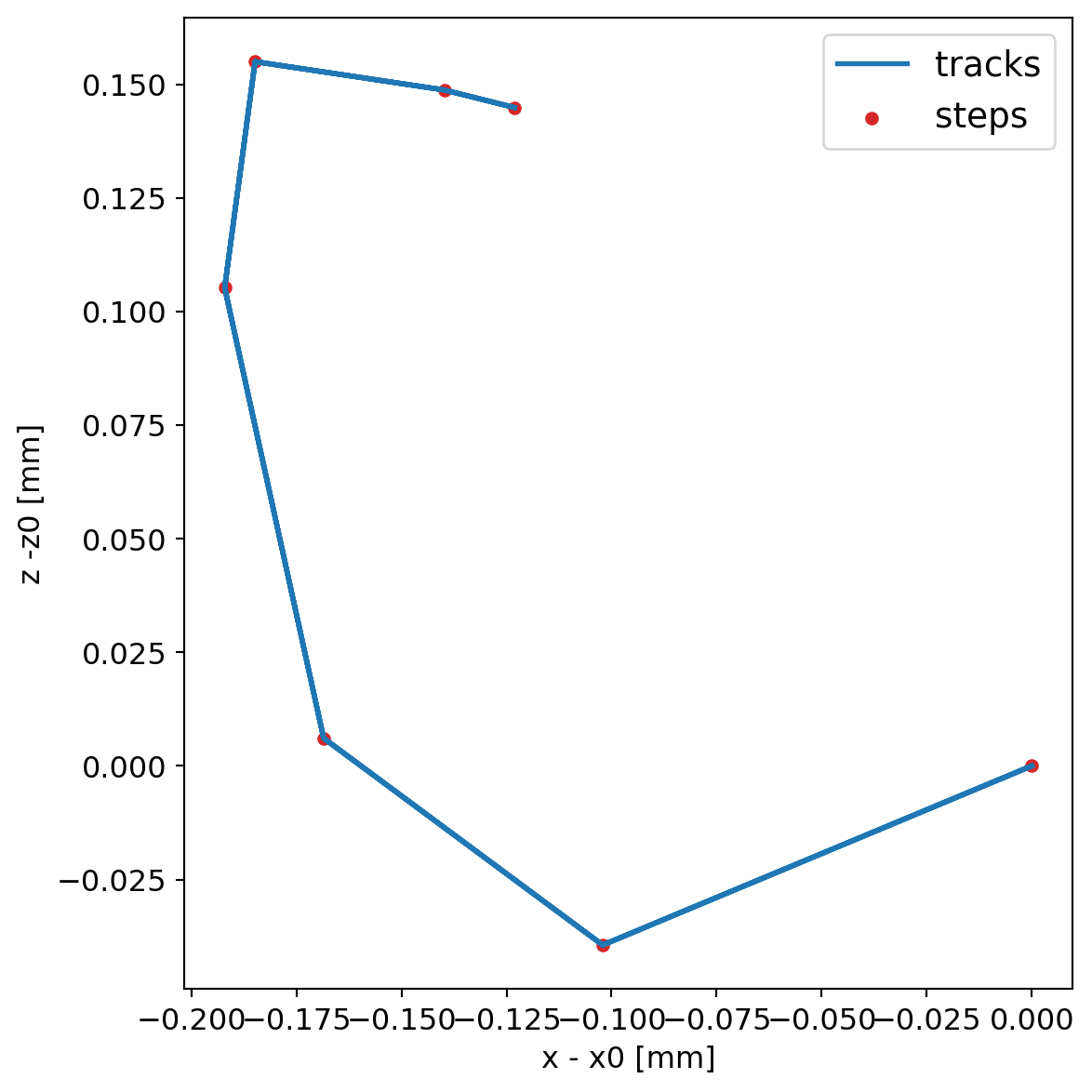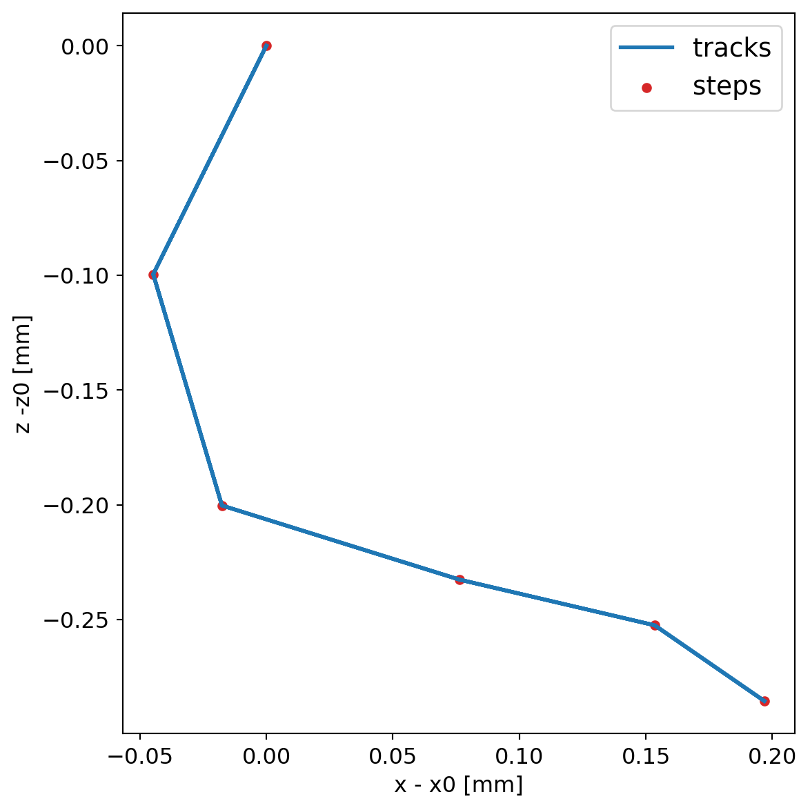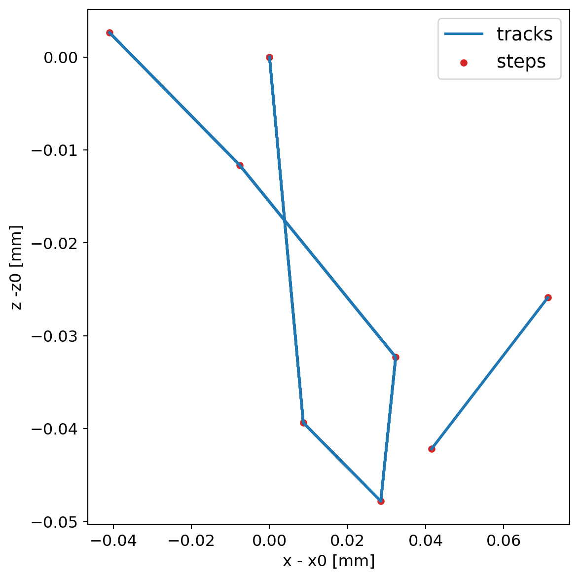We generate 1 MeV electrons and plot the steps for geant4, both without step limits and with 10 um step limitations.