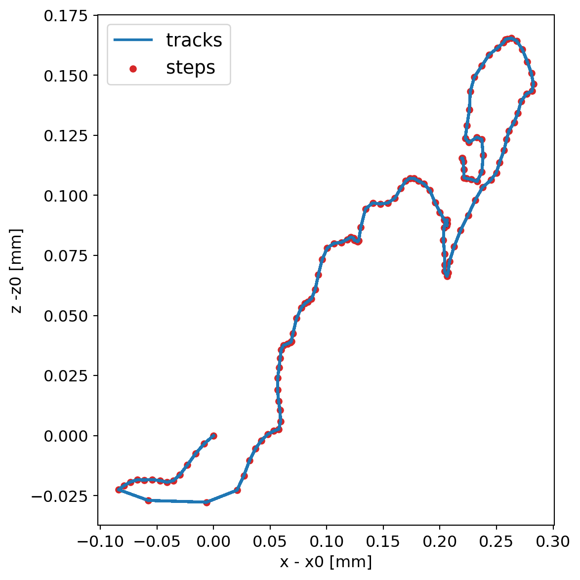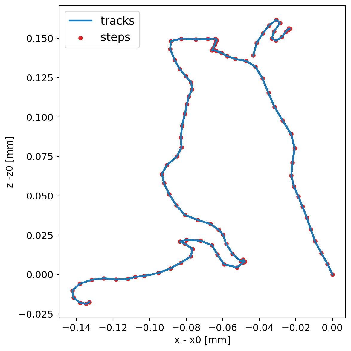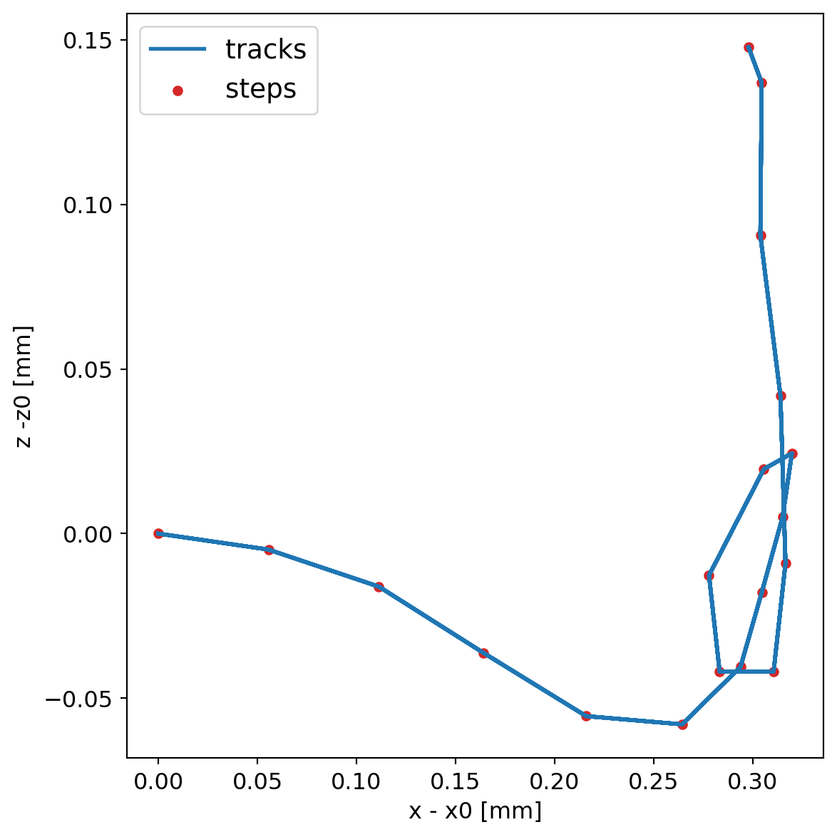 We generate 1 MeV electrons and plot the steps for geant4, both without step limits and with 10 um step limitations.