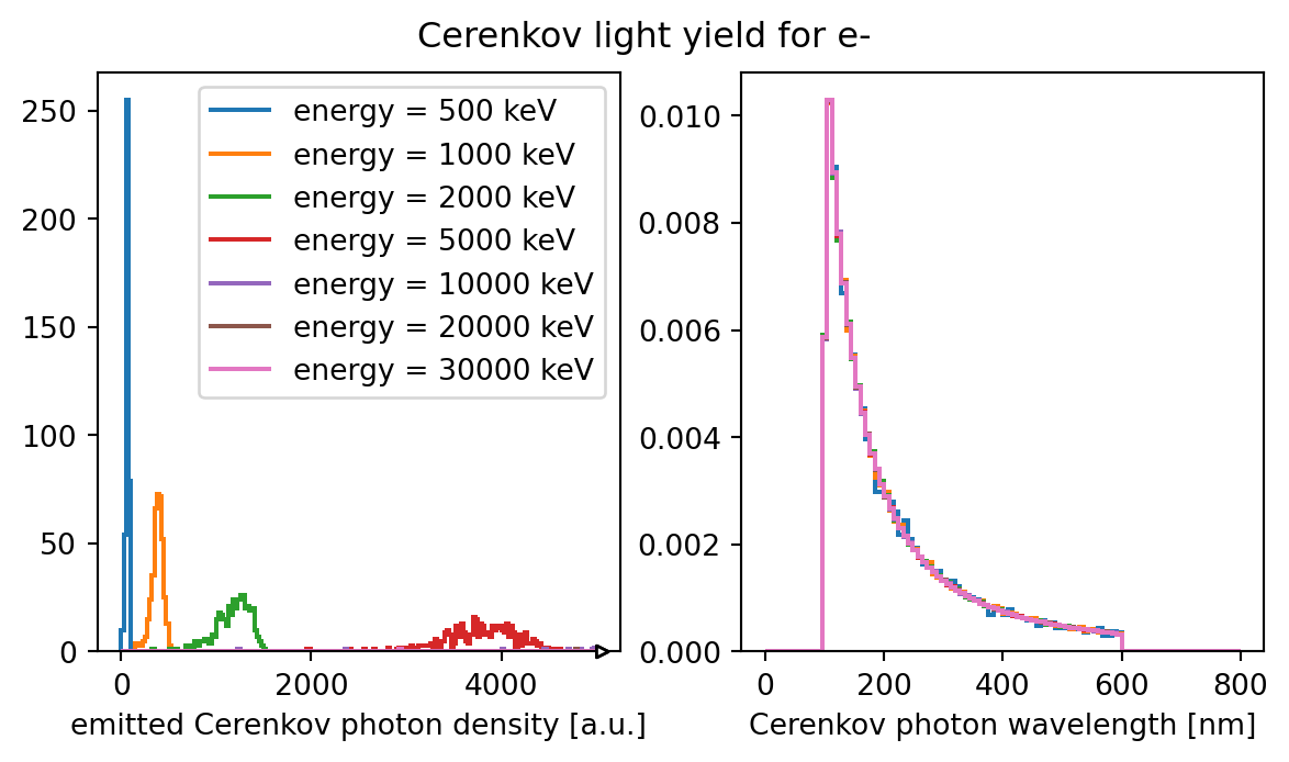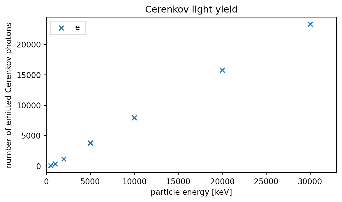 Electrons of varying kinetic energies are started in the center of a sphere of water. Optical photon attenuation is disabled. Scintillation emission is disabled. The number and energy of the created photons is recorded.