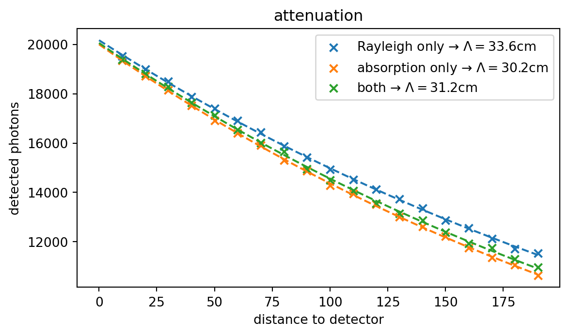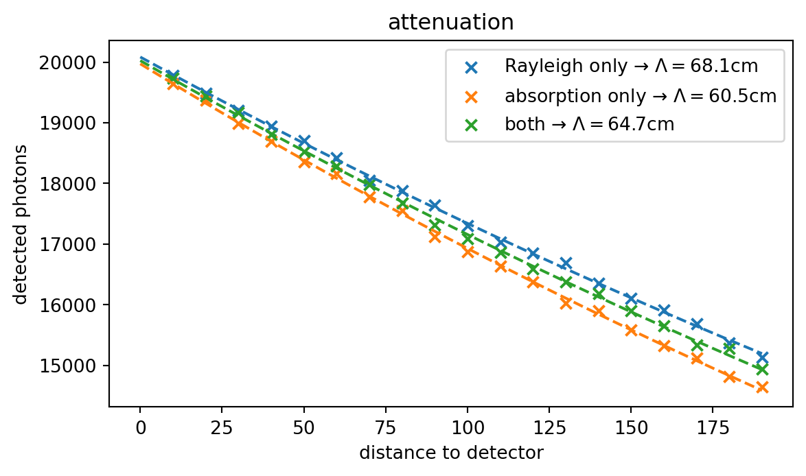 The absorption-only variant shows a clean fit of the expected attenuation length. In this simple case (without scattering), the absorption is fully linear. For the Rayleigh-only case, the fitted attenuation length is larger. This should be an effect of the finite aperture of the detector. Some forward-scattered photons will still reach the detecting surface, despite being scattered. The mixed case shows a behaviour in between the two cases.