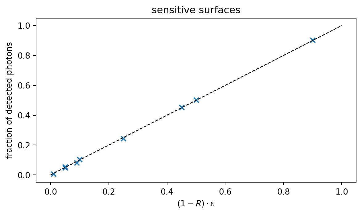 Monoenergetic optical photons are started above the detecting surface and the number of detected hits is recorded. Between the different runs, the values of the surfaces efficiency and reflectivity are changed.