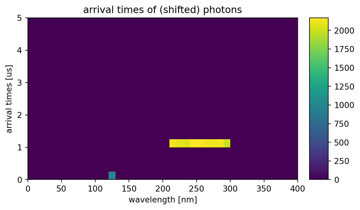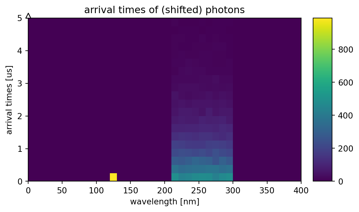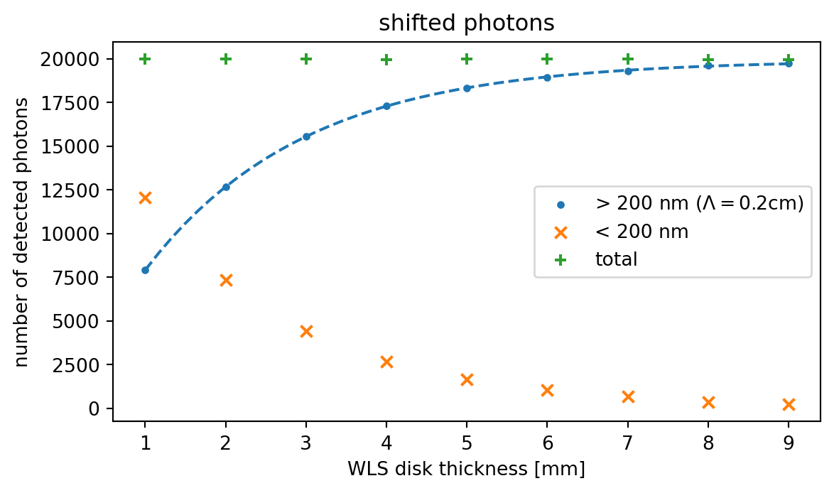 The simulation is repeated with varying thickness of the WLS disk. VUV photons of 128 nm wavelength are started; the detector records the photons with their wavelength, and also their arrival times.