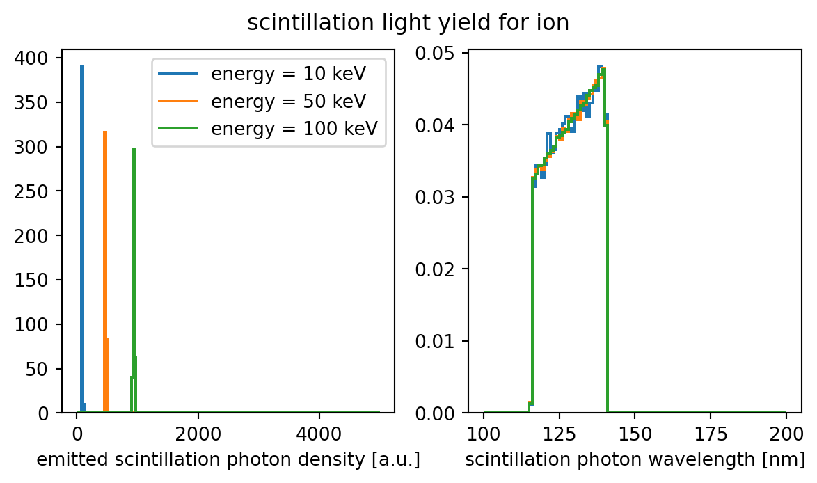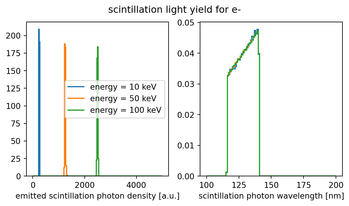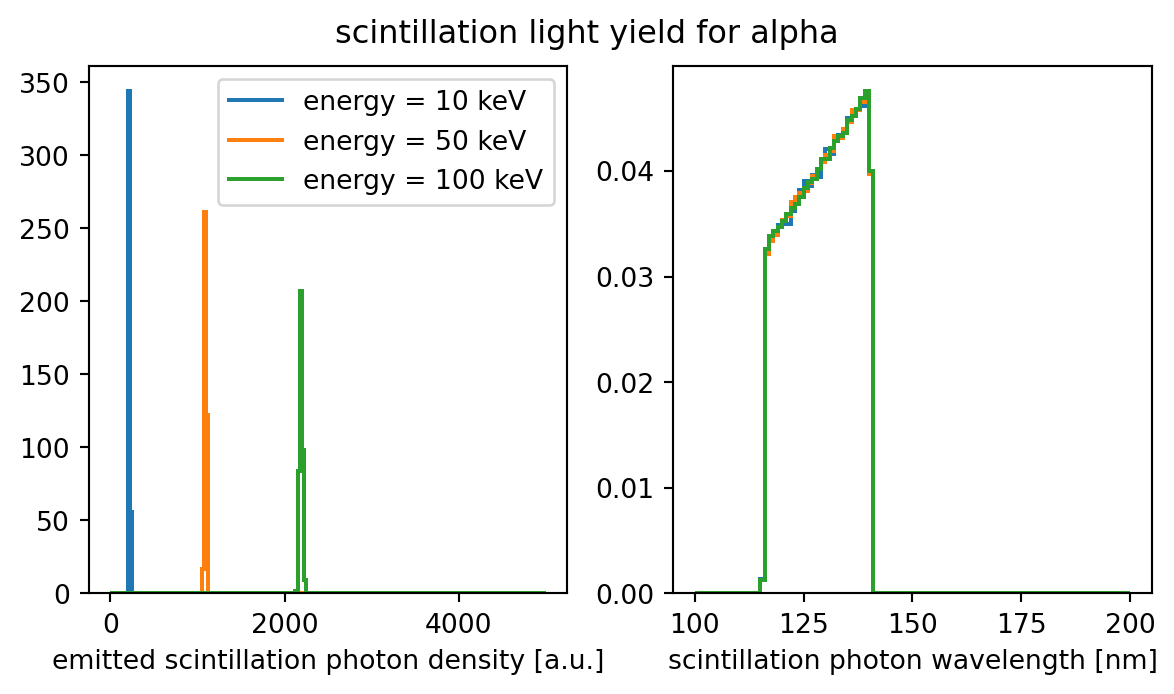 For all particles, the same emission spectrum around a wavelength of 128 nm is expected. We do not expect the typical narrow liquid argon emission peak here, as for this validation we implemented a broad shape (step-function) as the emission spetctrum[1]. For each primary energy, a narrow peak of emitted photons is visible, varying with particle type.