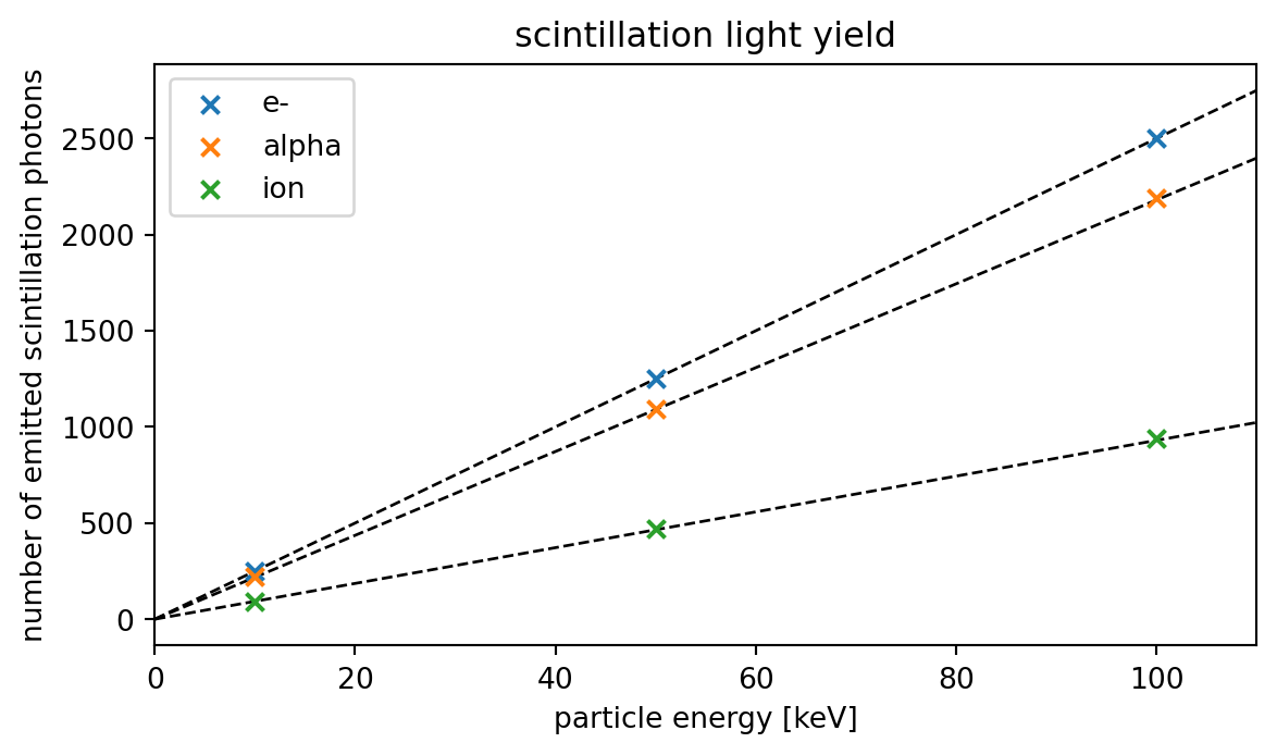 The light output for each particle forms a linear function. In the Geant4 simulation, the scintillation yield is implemented with a particle-type dependent linear function. The expectation is also shown in the plot.